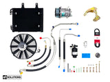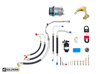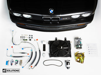 Our products are designed to support factory A/C models; however, to fit them into non-A/C applications you will need to obtain a factory HVAC wiring harness, high-pressure drier return line (64531381740), evaporator (64518391780), aluminum engine accessory bracket (64521717007), and factory interior HVAC box with sensors, control module, thermostat, etc. Additionally, we recommend replacing your OEM hardware with our A/C bracket and hardware kit.