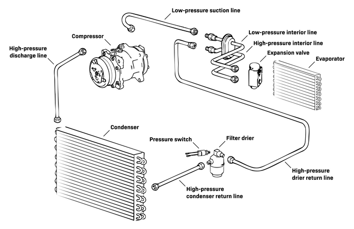 A simplified look at your car's automotive air conditioning system. This diagram models the E30 layout.